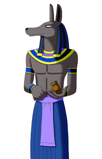 エジプトの死者の神で、死者の心臓を秤に 乗せて計量する仕事を任されている。 また、ミイラ作りの神であり、葬祭儀礼の考 案者でもあった。 黒犬またはジャッカルの頭を持つ人間とし て表される。