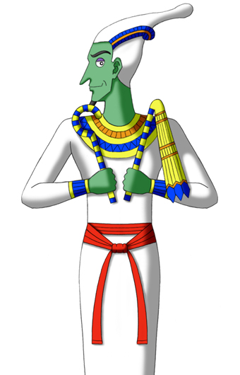 ホルスの父で、イシスの夫。 元は穀物神・植物神であったが、セトに謀殺さ れた後、復活して冥界の神となった。 ミイラの包衣から両手を高く挙げ、牧人の杖と 鞭を握っている。 最初の時の人々を文明の方法で教育し、説得 によって統治したとされる。